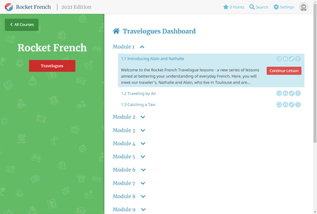 There are 40 downloadable (or streamable) audio tracks in the Rocket French Travelogues. Each of these tracks covers 2-3 chapters of Alain and Nathalie's travels around France. Just like the Rocket French Interactive Audio course, you can download these to play offline.